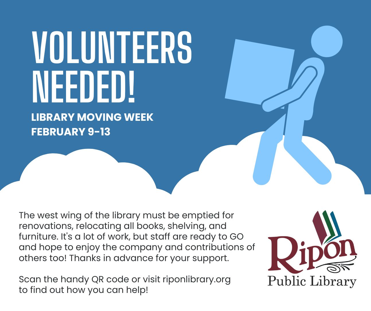 The library will be CLOSED Monday, February 9 – Sunday, February 15. We will extend due dates through February 23 for any material due on those dates. Please avoid returning material during this week as we will be unable to process it – staff will be busy all week moving shelving and material. We will also be unable to accept any donations for the Friends of the Library during the closure.